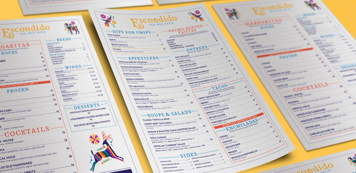 Making Tex-Mex upscale with this “hidden” gem in Dallas, White Pants used authentic Mexican Otomi embroidery as the inspiration for the branding for Escondido. The Otomi illustrations bring a sense of authenticity to bring the brand to life. Work included logo design, menu design, custom illustrations, collateral materials including coasters, beverage napkins, interior and exterior signage, and more.